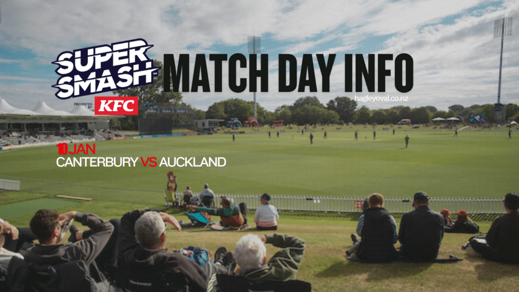 8 January 2026. Super Smash at Hagley Oval continues this Saturday with the second home game getting underway when Canterbury takes on Auckland. For those coming along, we have put together some key information to ensure you have the best match day experience as possible! Key Match Details and Timings Tickets purchased for this match day gains you entry for BOTH the Women’s and Men’s match. Members and Guests The Miles Group Members Lounge will be open from 1.10pm for Pavilion Club members and their guests. Entry is via the Hadlee Pavilion main reception. The Pavilion bar will be serving food and beverages throughout the day from a limited Bistro menu. Please note that Hagley Oval is a cashless venue — all purchases can be made by card only. Public Facilities and Amenities Food and Drink For this match day, the following vendors will be onsite for food and beverage purchases. Patrons are allowed to bring in sealed plastic bottles (up to 1 litre in size) containing non-alcoholic beverages for personal consumption. Non-alcoholic cans are allowed however they will be depressurized on entry. Small amounts of non-commercial food intended for personal consumption is also permitted. See our full match day entry visitor guidelines here. Safety at the Oval Cricket is full of excitement — and the occasional flying ball!For your safety, please keep an eye on the play at all times and remind those with you to do the same, especially children. From time to time balls can be hit